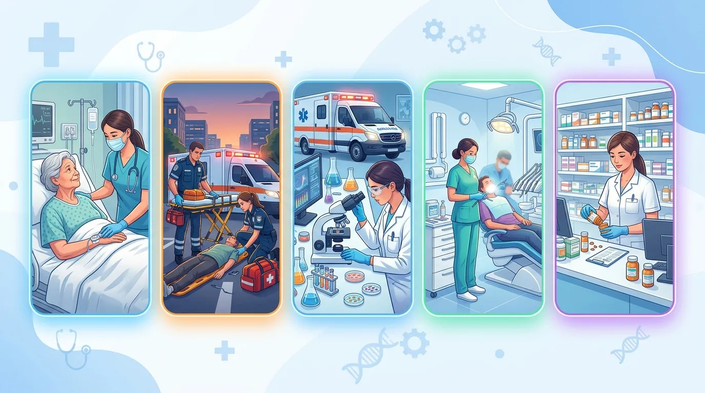 Важно: конкретные требования к образованию и допускам зависят от страны, региона и типа учреждения (гос/частное). Но в целом перечисленные ниже профессии относятся к сегменту, где высшее медицинское образование не является обязательным условием входа.